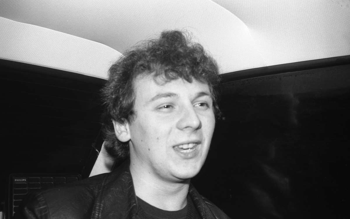 Paul Cooijmans eating a croquet roll in imitation leather jacket