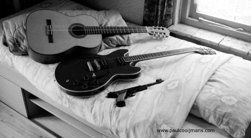 Hanika 10-A classical guitar and Gibson ES 335 DOT Cherry lying on bed with attribute for keeping order
